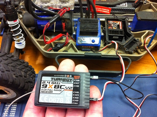 This is where I had to improvise a bit, since I do not have the proper connectors yet to connect the quad battery. I do however, have a Traxxas Slash with a perfectly good battery and speed controller, so I decided to use that for the purposes of binding the radio and doing some experimentation. Using YouTube as a general guide, I plugged the ESC into channel 3 of the receiver, plugged the battery into the ESC, and powered on the ESC. The connectors are universal. Sure enough, the red light on the receiver began flashing, indicating it was ready to bind.