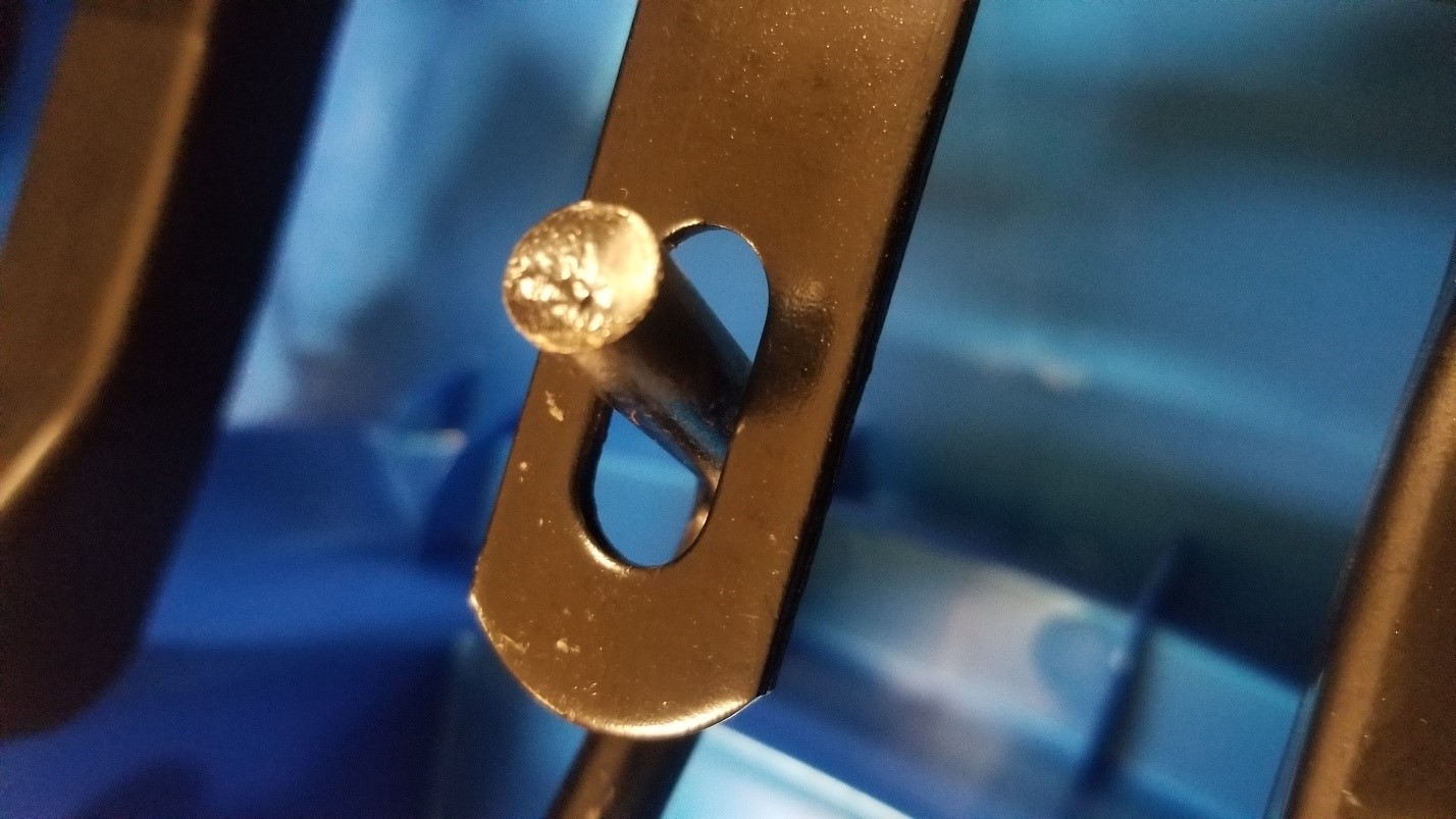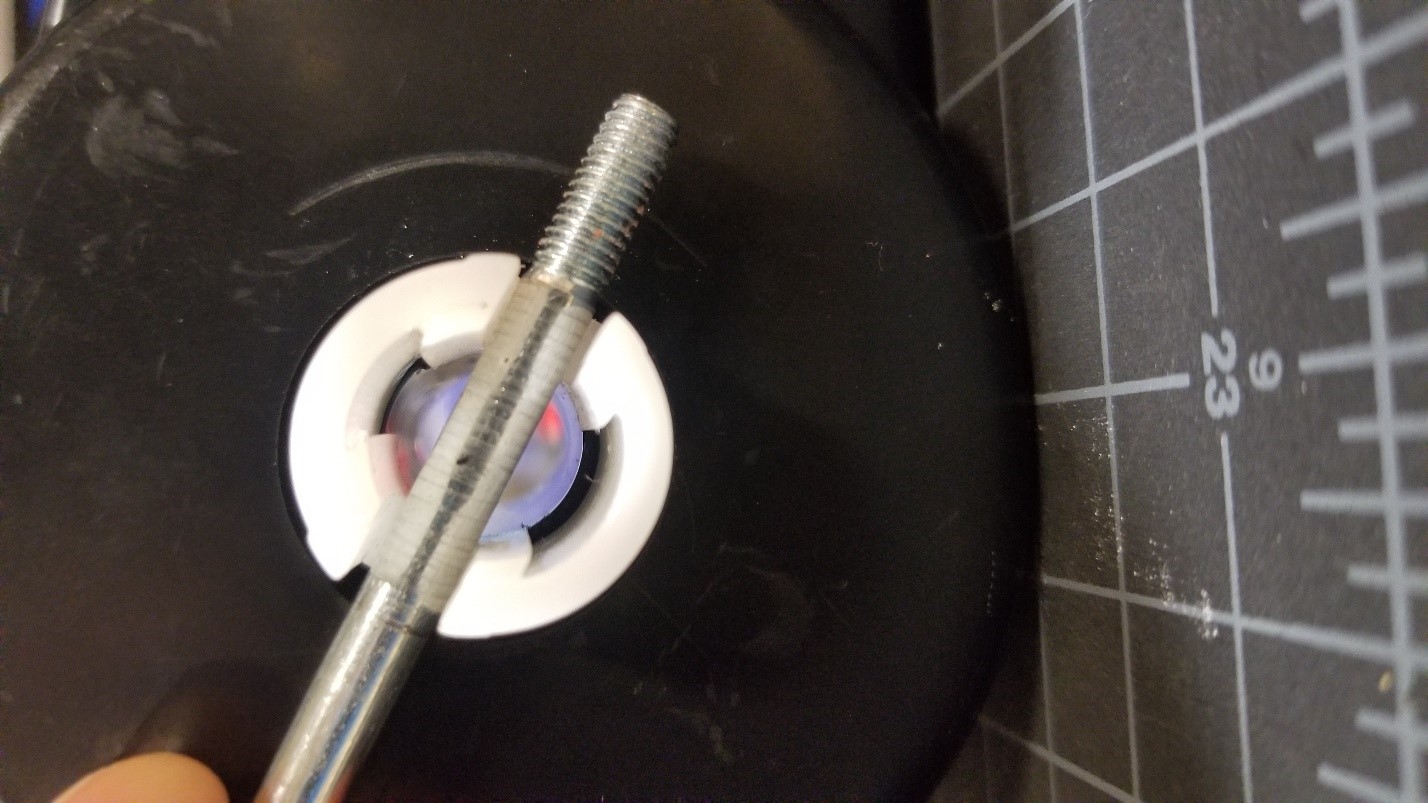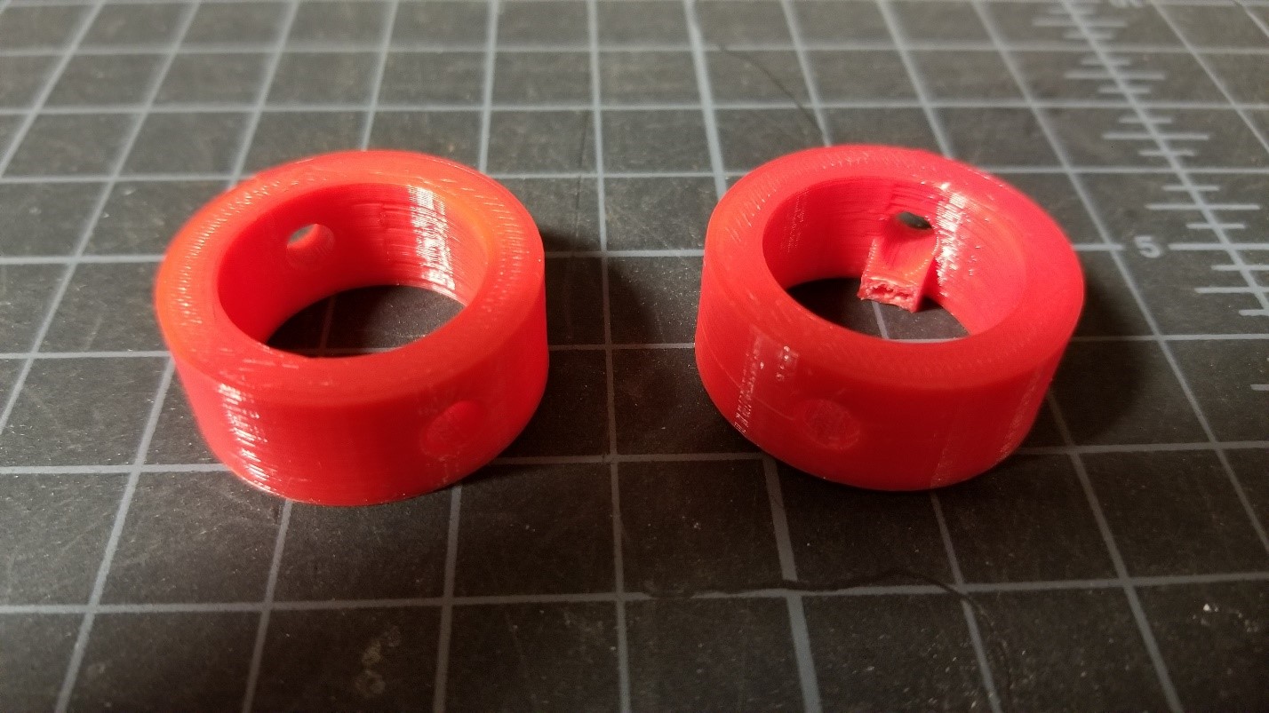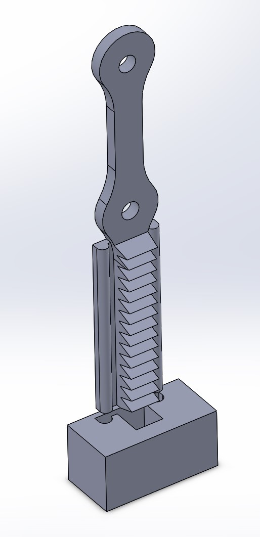 Here is a comparison from the initial concept design to the final version of the throttle arm. The threading is larger and guide rails have been added to keep the travel linear. The upper hole is for mounting to the pedal and lower hole is a stop pin to ensure consistent travel length.