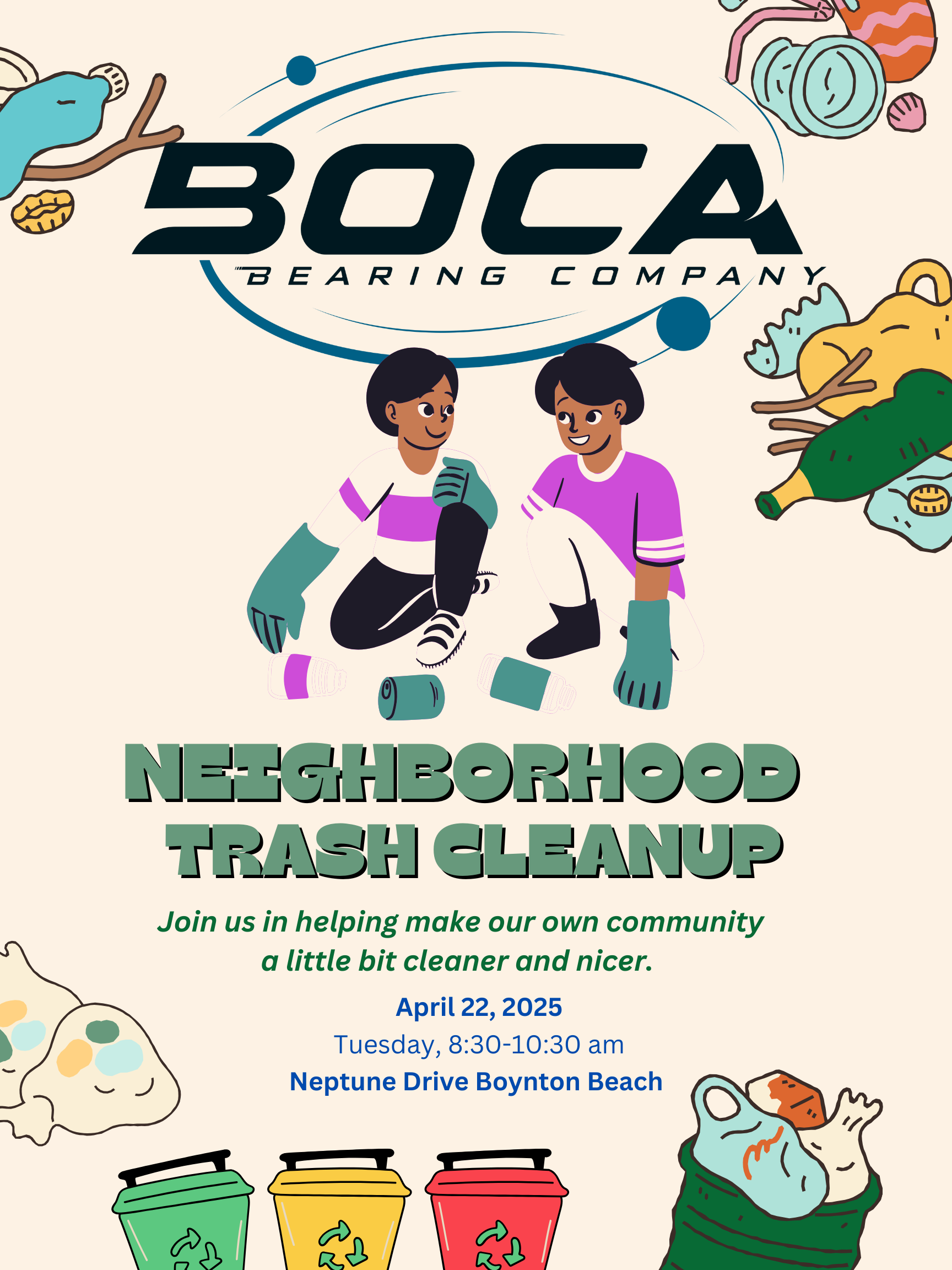At Boca Bearings we believe in thinking globally and acting locally. While our sustainability initiatives are designed to minimize our environmental impact worldwide, we are equally committed to making a difference in our local community. Recently, for Earth Day our team participated in a neighborhood cleanup, demonstrating our dedication to maintaining a cleaner, healthier environment right where we live and work. Together, we’re building a more sustainable future—one community at a time. This is how we roll.