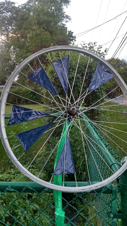I need to rethink blades to better capture wind. The vinyl on spokes approach is better than the saran wrap I tried but hardly a resounding success. Comments bellow on other approaches would be appreciated. Current improvement that occurs to me is tacking  pre cut blades sheet metal to the spokes.