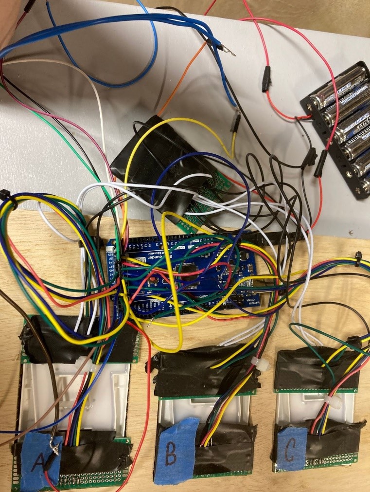 After the switches were wired to the battery pack, all the cables and cords were connected to the Arduino to test the response to power input. This process included software configuration as well, with each wire connecting into the Arduino needing to be variably established in order to elicit a response to specific segments. As seen in figure 12, the LEDs were labeled A-C, to maintain understanding of their pins and to stay organized.