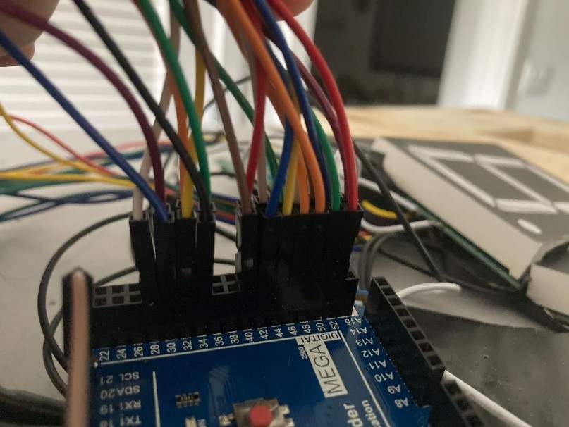 The code begun by definition statements, which established the individual pin values that each LED segment wire was connected to on the Arduino. This initial definition section was not functional due to the wires not being connected to the right segment pins. This problem was solved by debugging and lighting up individual segments with their corresponding pin value. The process was repeated for all 7 segments on each LED.