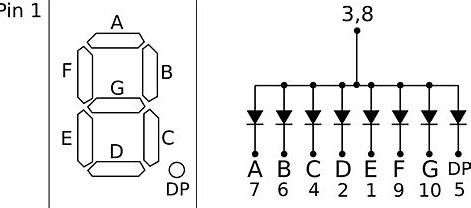I determined that the LEDs were common anode via testing the pins as either ground or power. This then impacted the order which the pins would register as the individual lines, making up the visible numbers. As seen in Figure 2, the segments are referenced by letters A-G, representing segments 1-7. This information played a key factor in designing the wiring and resistor layout.