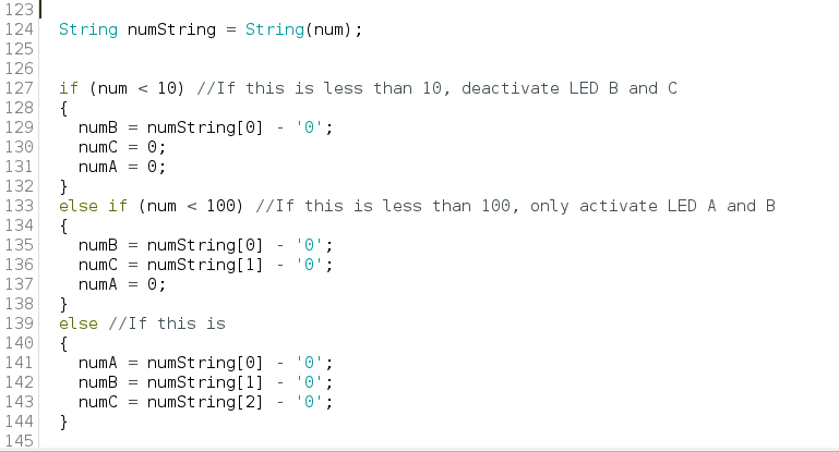 This grouping of if/else statement declares that if the value of the count is under a certain range, to only activate specific LEDs. This is seen in the comments in the first if (num<10), which references the statement that if the value of the count is under 10, to only activate numbers on the first LED. This is then also established for the second and third blocks of statements, which correspondingly implement the same concept however, in application to under 100 and over 100. If the value is under 100, only the first two LEDs are activated, representing numbers such as 20, 60, and 80. If the value is over 100, all three LEDs are activated, displaying numbers such as 120, 160, and 180.