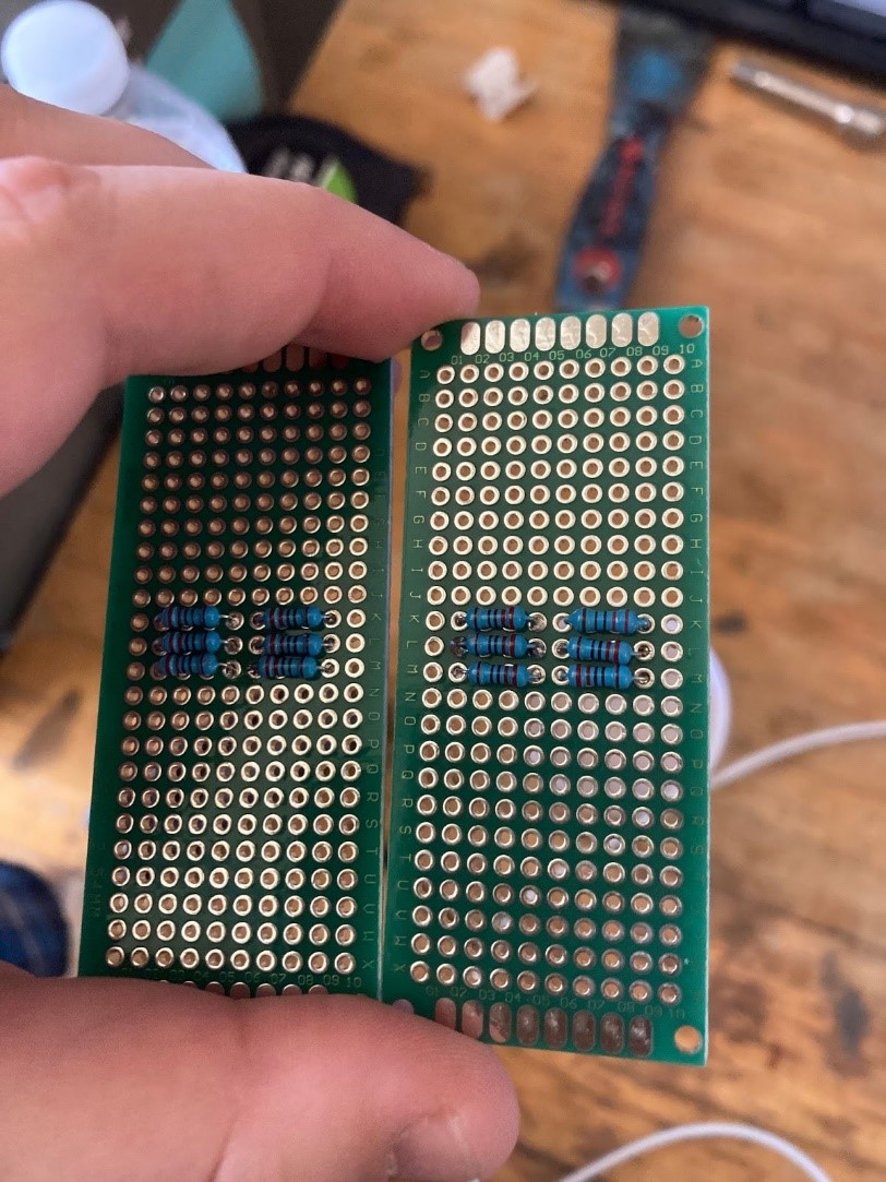 Due to the high voltage requirement of 8V, I needed to design a resistor layout with 220Ω resistors on the perforated breadboards to protect the Arduino Mega, which had a maximum voltage tolerance of 5V. With these resistors, they acted as a step down for the voltage and would allow the LED to still get the 8V+ necessary but cut the voltage down to 5V to remain functional with the Arduino. If these resistors were not laid properly or included, then the Arduino would’ve short circuited. With the design of the resistors, it was important to link them by soldering onto the board, however it was a delicate process because if any of the singular resistor solder touched another resistor, it could not be controlled individually. This was an extensive process, lasting over 6 hours as there were 2 boards which needed to be designed, soldered, and placed onto each of the LED’s.