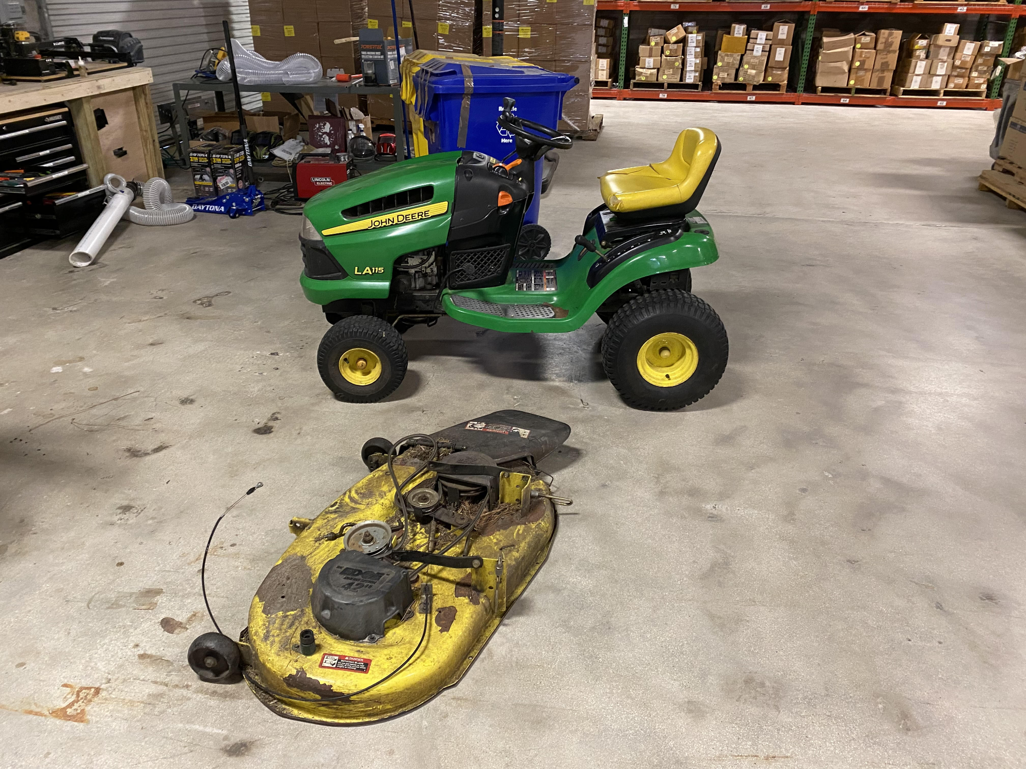 In our research we found that there are two main engine brands that are commonly used in consumer mowers Kohler and Briggs & Stratton. Of these two Kohler is arguably the better brand for long term stock dependability these days, however it isn’t by much and aftermarket performance parts for Briggs & Stratton engines are significantly easier to source. With this in mind we decided to go with a Briggs & Stratton platform. And after shopping around we found a used John Deere LA115 with a new single cylinder 33R877 engine in it that fit the bill perfectly and was equipped with a hydrostatic transmission.