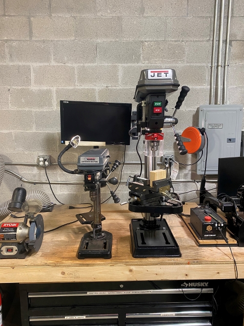With these criteria in mind we came to the conclusion that given the choice between a low-end Harbor-Freight bench-top minimill and a high-end bench-top drill press with a machinist vise, the drill press and vise combo was probably the safer bet. So after some research we settled on the JET Model J-2530 as our drill press of choice for the shop.