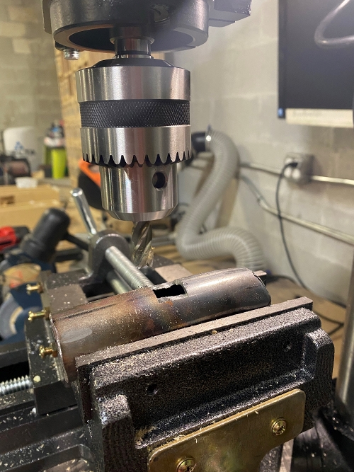 While this machine may have cost ten times more than what our old drill press did, I honestly think this is one time ten times the cost does equal ten times the performance. There are still a few kinks to iron out with the system but most of the stem from the vise itself and not the press. These include a kind of odd mounting slot size that we need to source the right bolts for, the handle on one axis not quite hanging off the side of the work plate, and just general play in the vise that needs tuned. But these are small issues and we have plans on how to fix them. Despite these small issues we did get the vise secure and stable enough to do some quick test cuts on a piece of scrap pipe we had in the shop as you can see in the picture below.