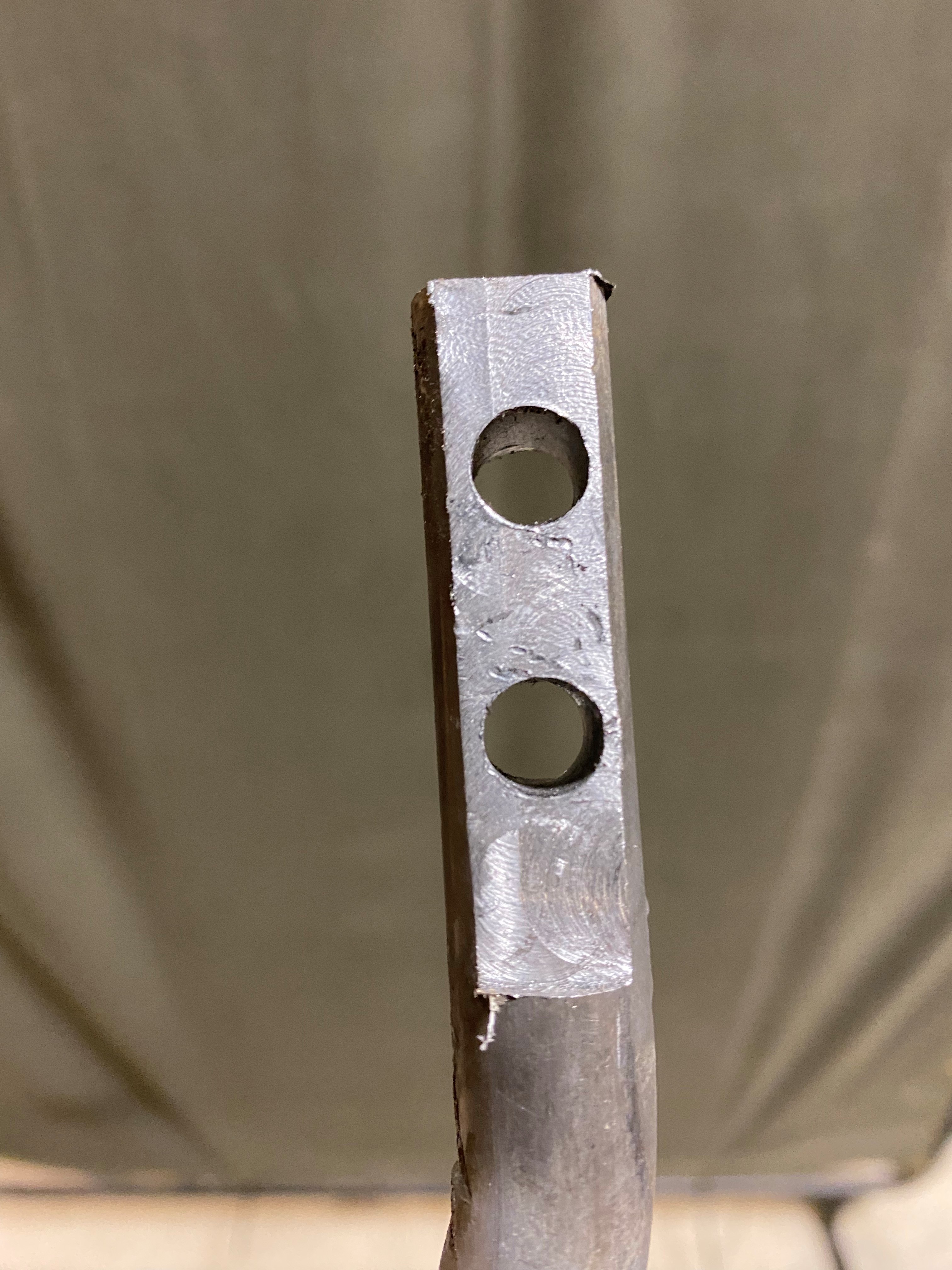 As this is more of a handbrake style of braking system I made a bracket out of some salvaged tube steel and mounted it to the right hand side of the frame. Upon installing I found that the original bent tube brake lever was just asking to snap, so using our new drill press I machined a flat on a piece of round steel stock, drilled the mounting holes, and then bent it to shape using the vice and blow torch.
