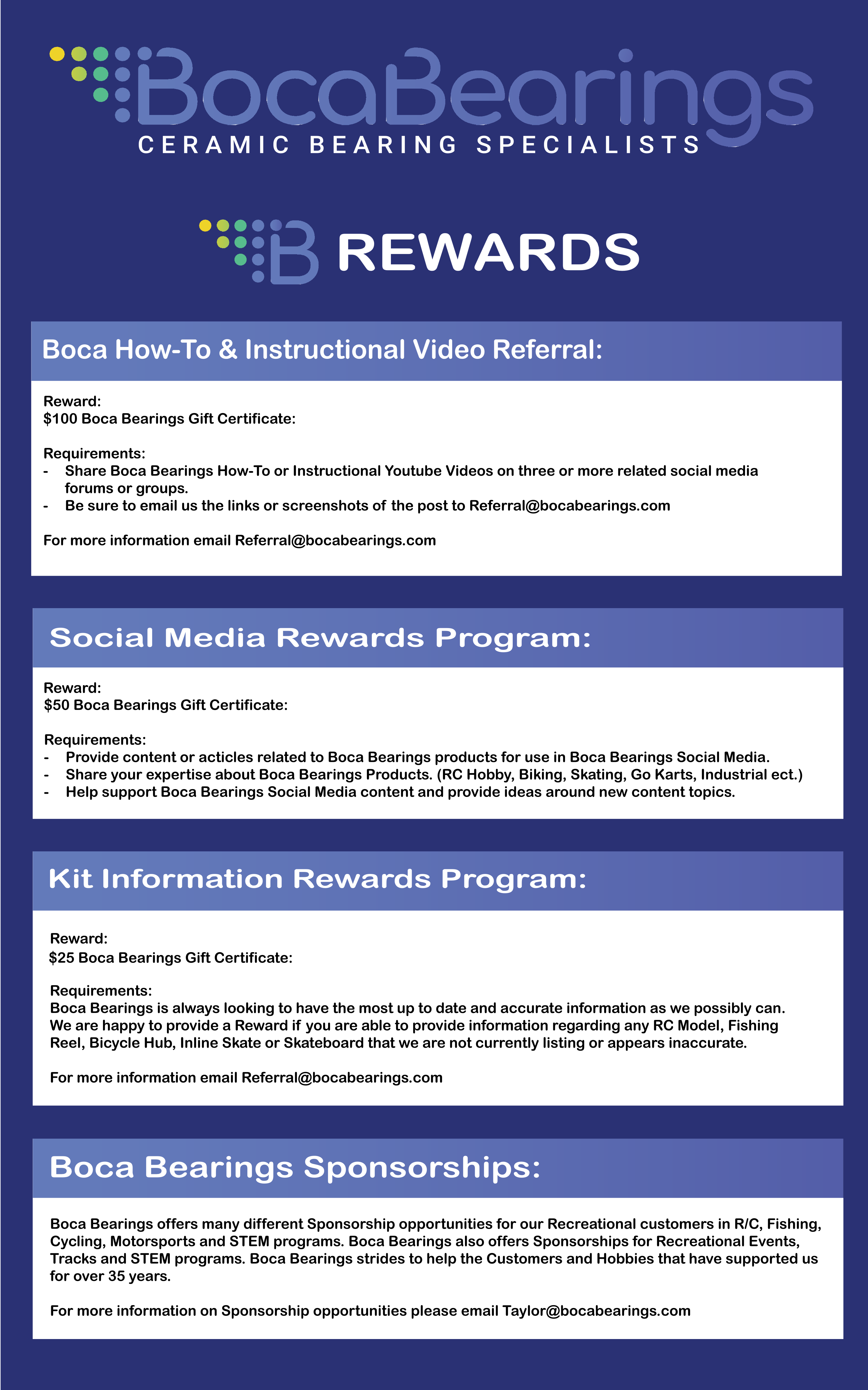 Rewards & Discounts Programs Get actively involved to help us promote Boca Bearings and become part of our family.